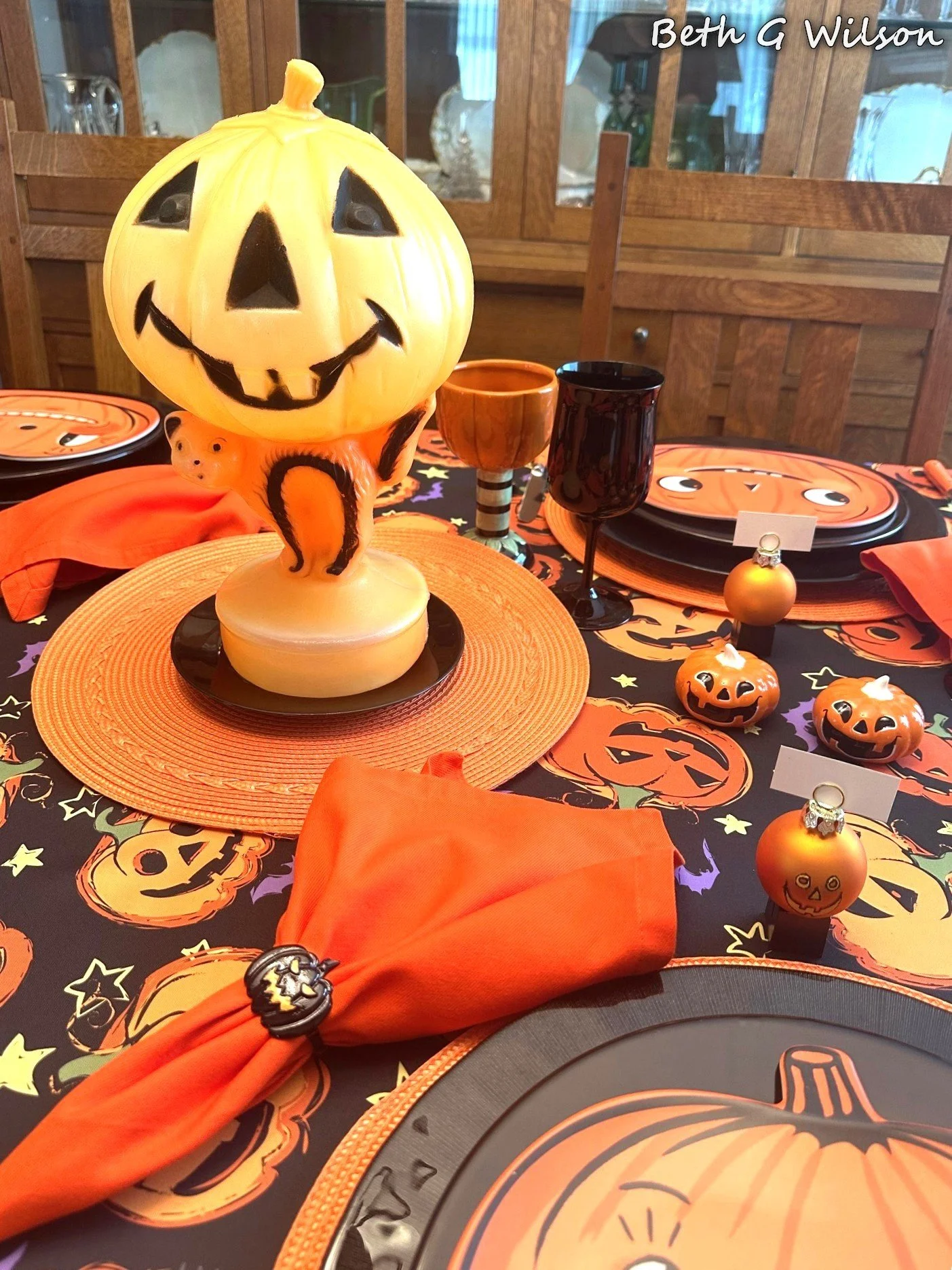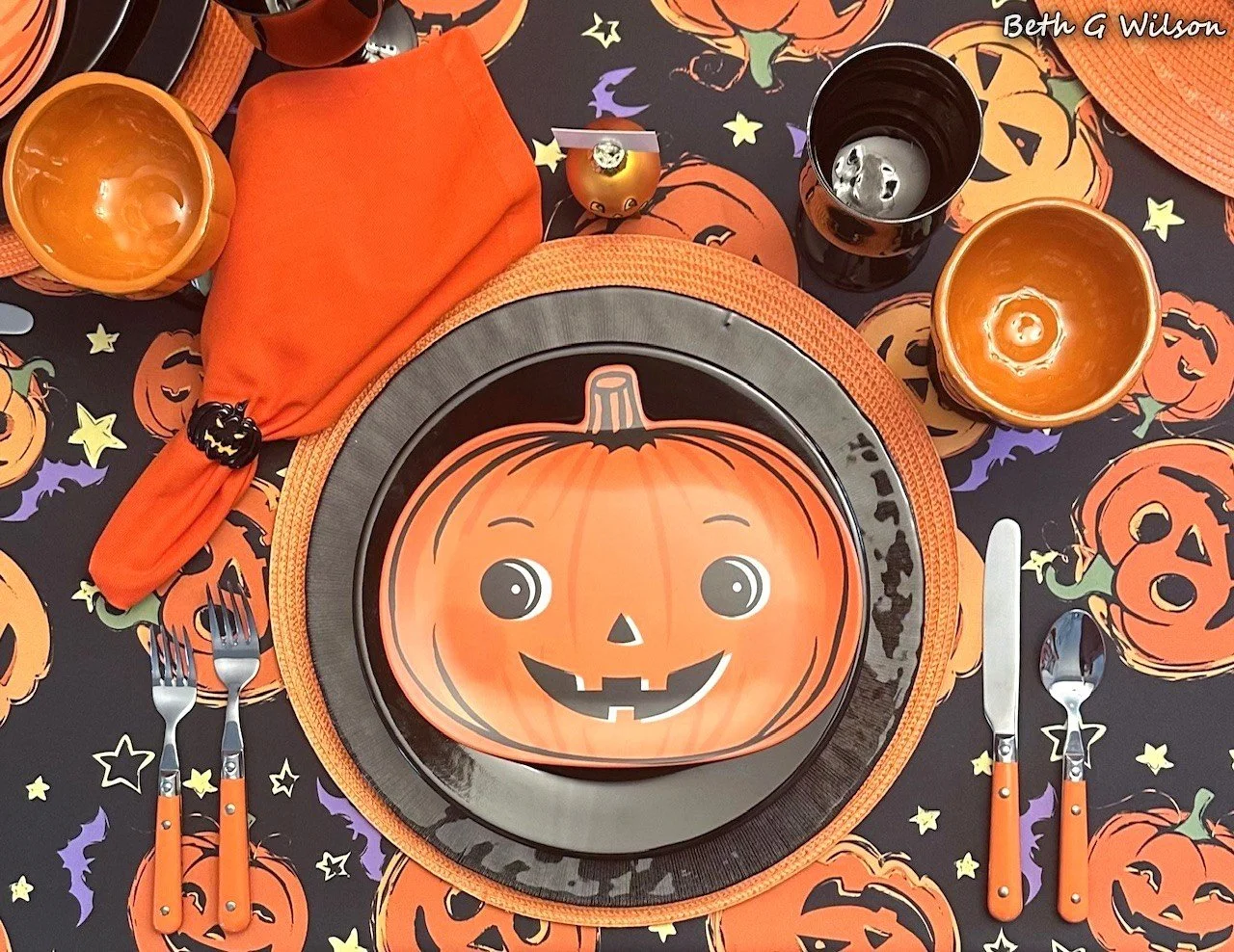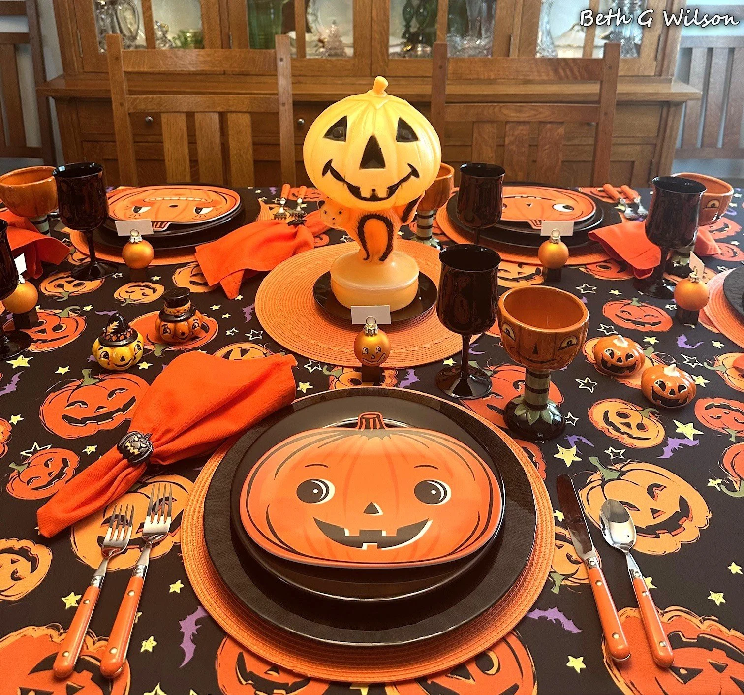 I posted this Halloween tablescape five years ago and I decided to post it again because it is one of my favorites. Another tablescape that Hubby did the grunt work for. I tell him what to pull from the shelves in the garage and boom, it’s done! He moves fast! I have to admit I really love the traditional black and orange Halloween colors on this tablescape, they really pop. The design is a bit busy but sometimes I just like mixing patterns and Halloween designs are busy anyway. If you compare this table to another Halloween tablescapes that I created with the same jack o lantern salad plate here you can see a few of the same elements on both tablescapes but many elements are different. I bought this black and orange buffalo print tablecloth at Bed, Bath & Beyond online several years ago. The black placemats in the center came from Pier 1 several years ago.