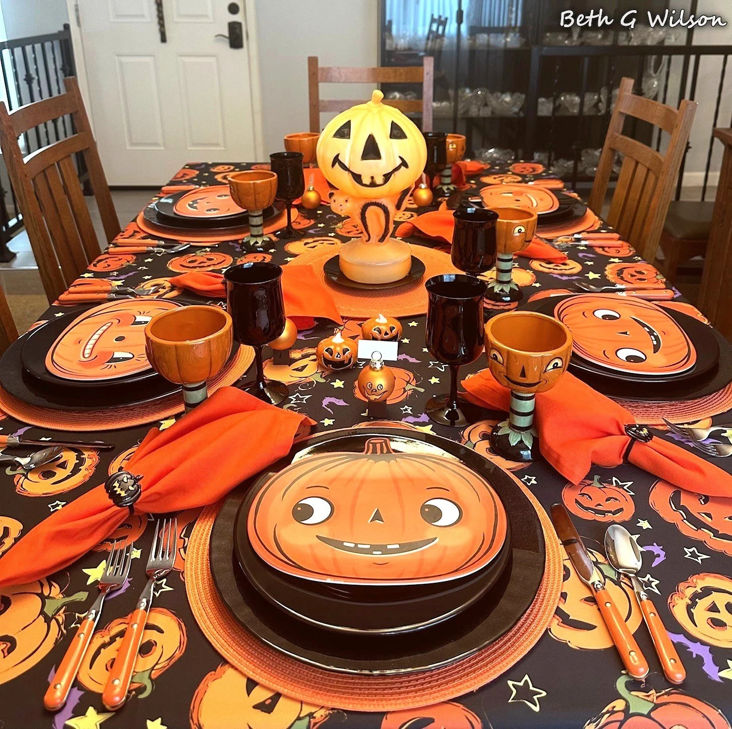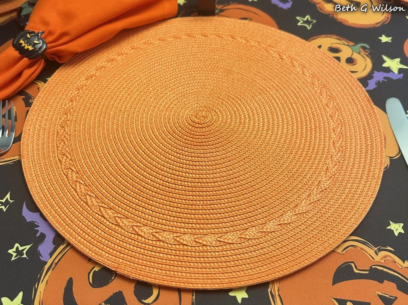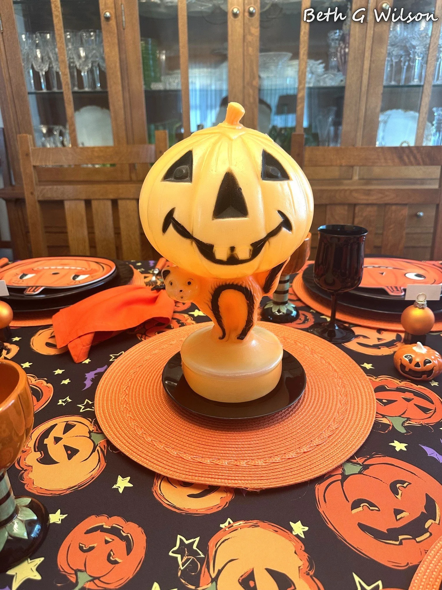 I posted this Halloween tablescape five years ago and I decided to post it again because it is one of my favorites. Another tablescape that Hubby did the grunt work for. I tell him what to pull from the shelves in the garage and boom, it’s done! He moves fast! I have to admit I really love the traditional black and orange Halloween colors on this tablescape, they really pop. The design is a bit busy but sometimes I just like mixing patterns and Halloween designs are busy anyway. If you compare this table to another Halloween tablescapes that I created with the same jack o lantern salad plate here you can see a few of the same elements on both tablescapes but many elements are different. I bought this black and orange buffalo print tablecloth at Bed, Bath & Beyond online several years ago. The black placemats in the center came from Pier 1 several years ago.