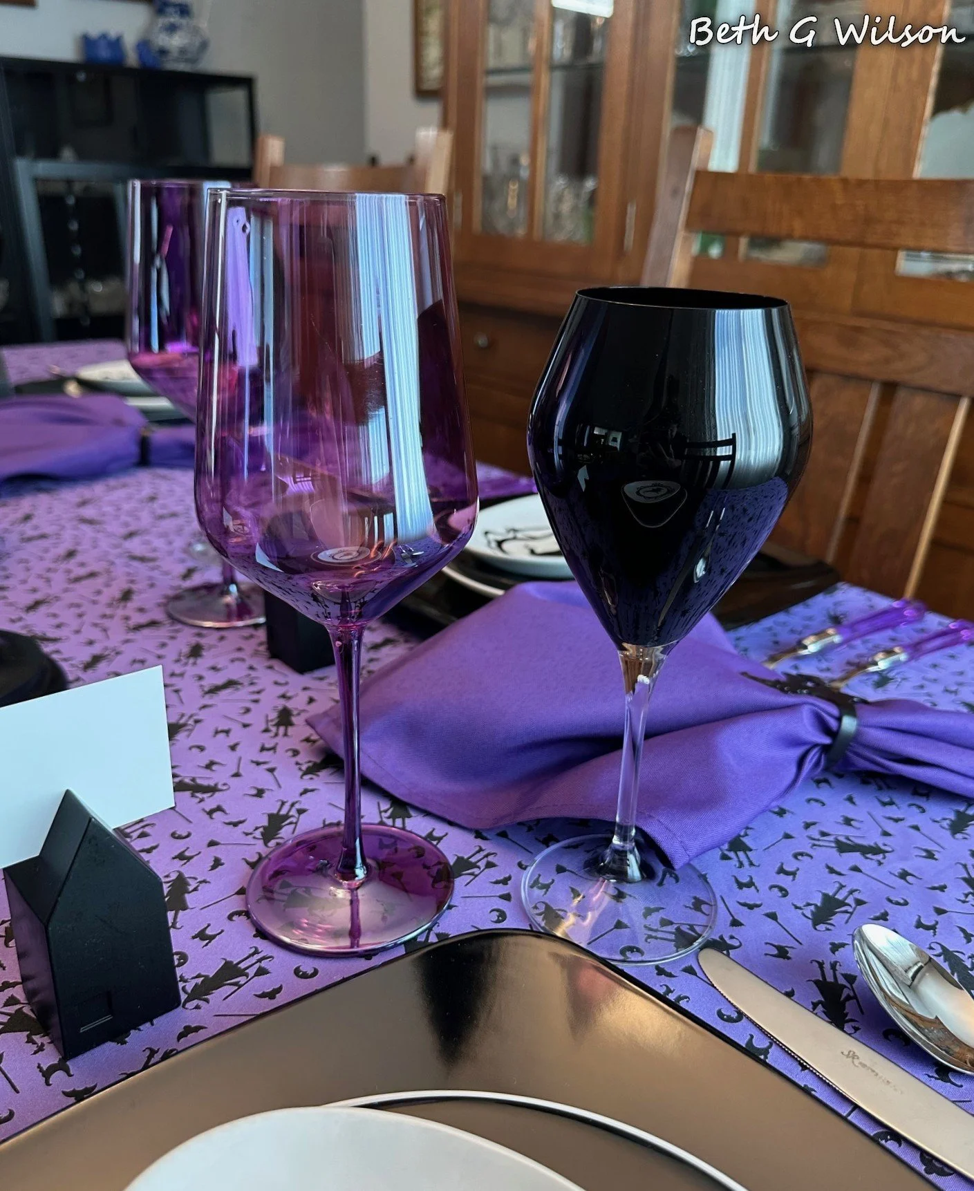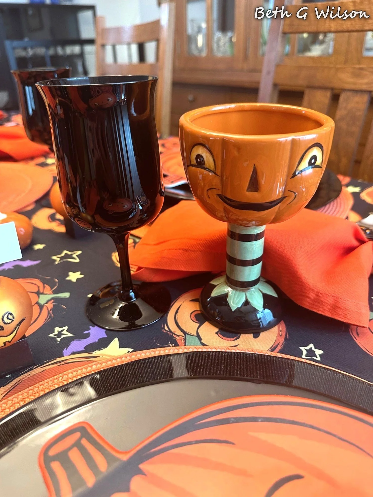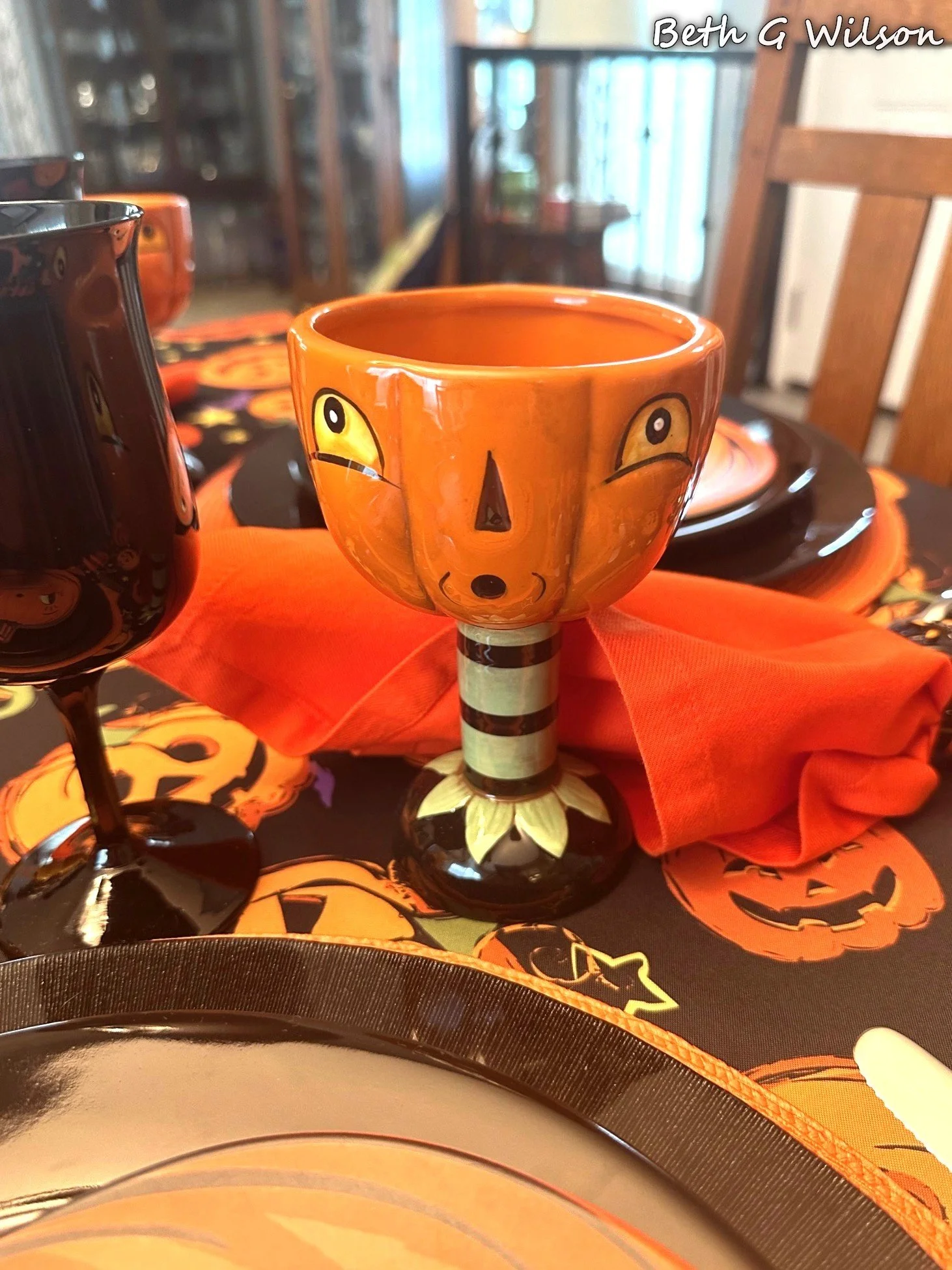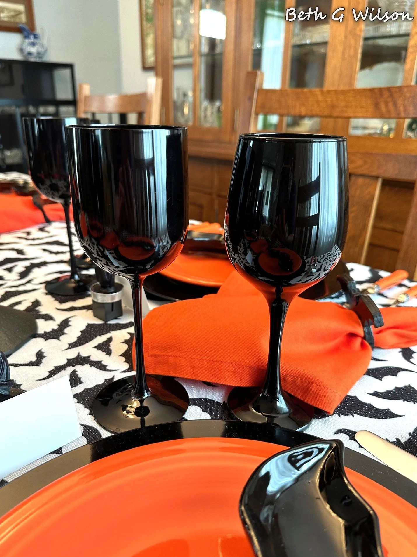 I think I bought the orange glass goblets at Ross or T.J. Maxx. They were some of the first goblets I bought several years ago. I remember thinking that I would probably not use them very much but I have, especially this time of year. Just fyi, Dollar stores often sell plastic goblets like this one. The goblet with the black bowl and clear stem was made by Classic Touch and is called V-Shaped Water Glass, Black With Clear Stem. I bought them at Houzz online a few years ago. You can read my blog post about what to consider when you are buying goblets for your tablescaping collection including the colors that I use most often here.