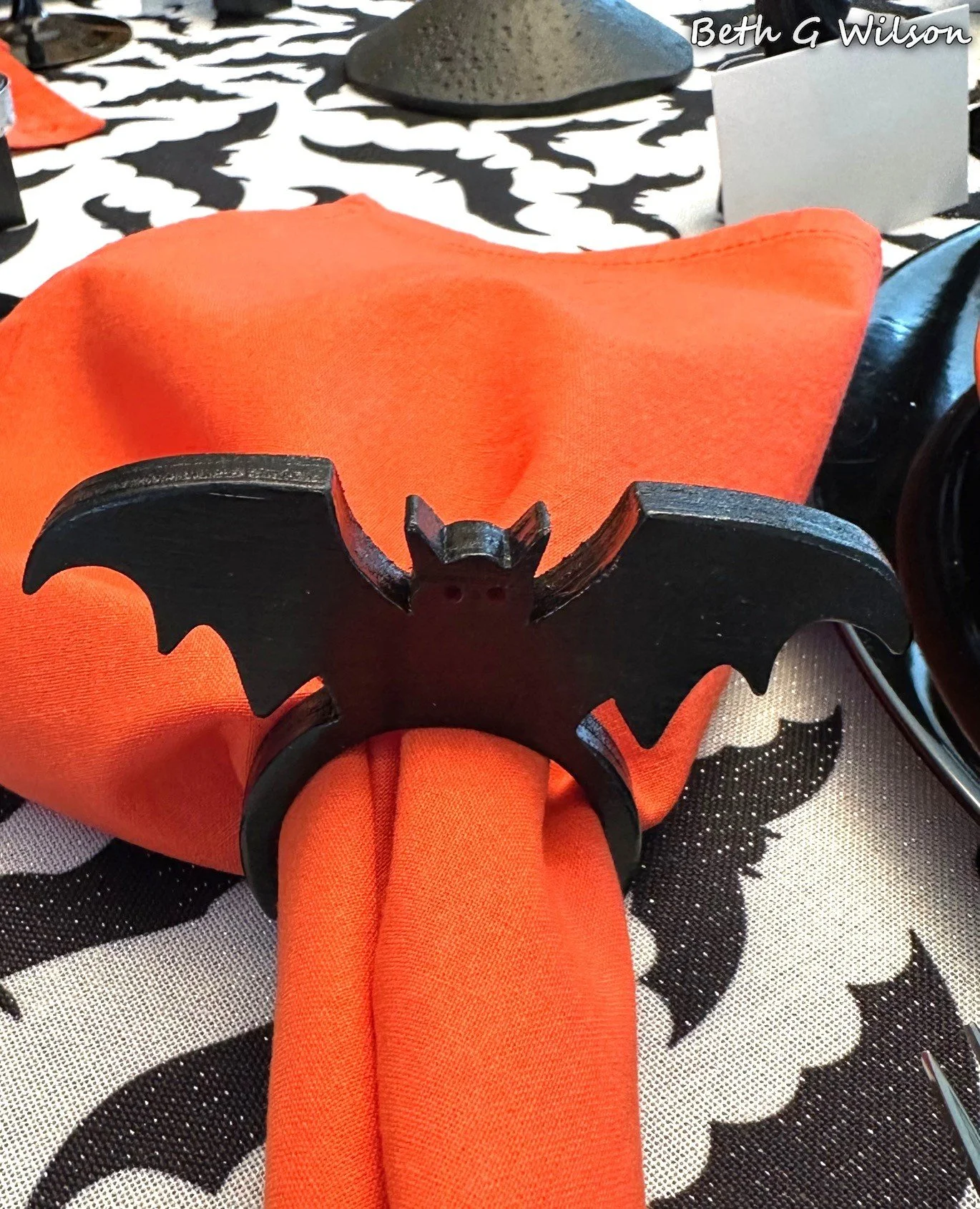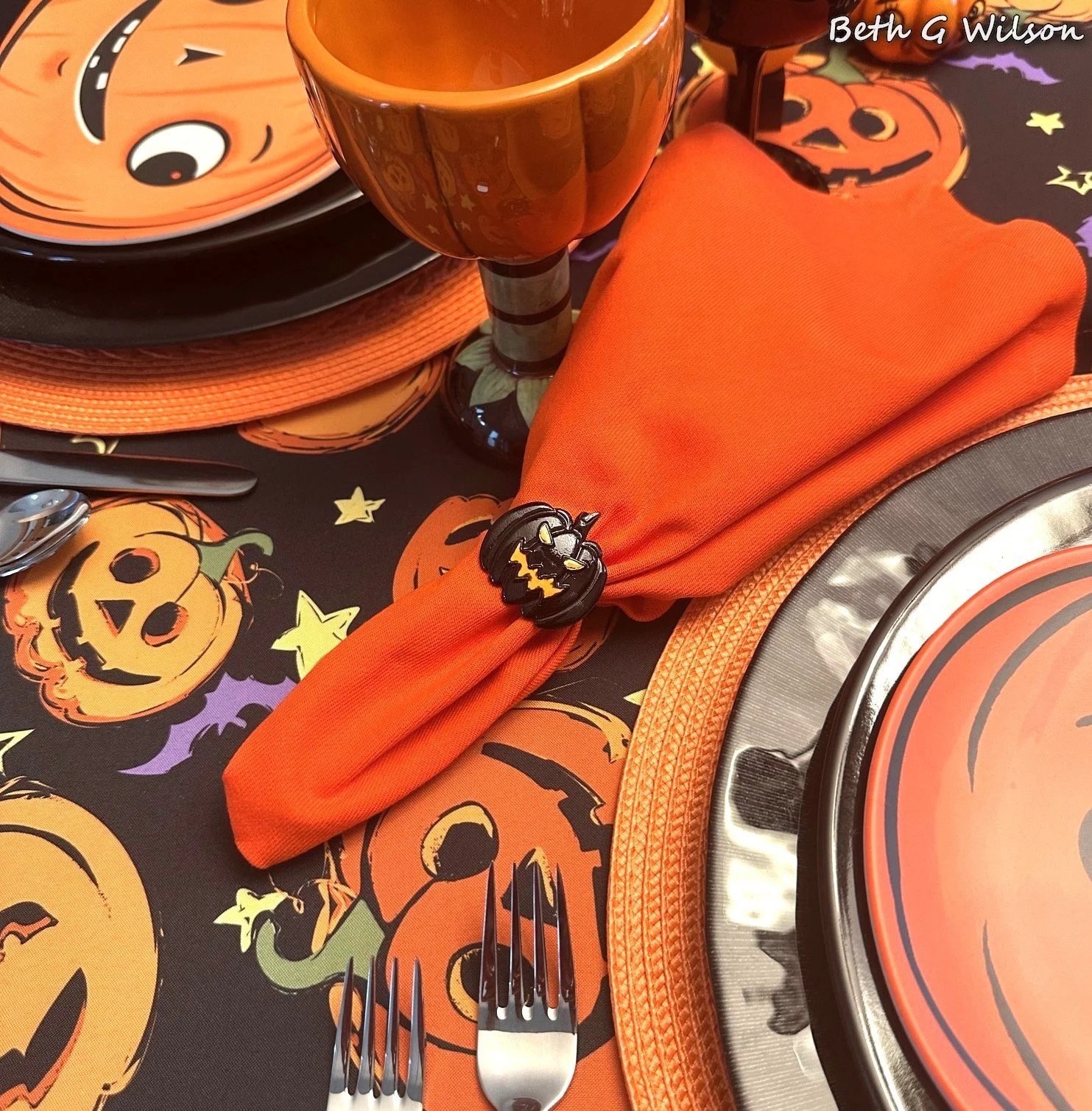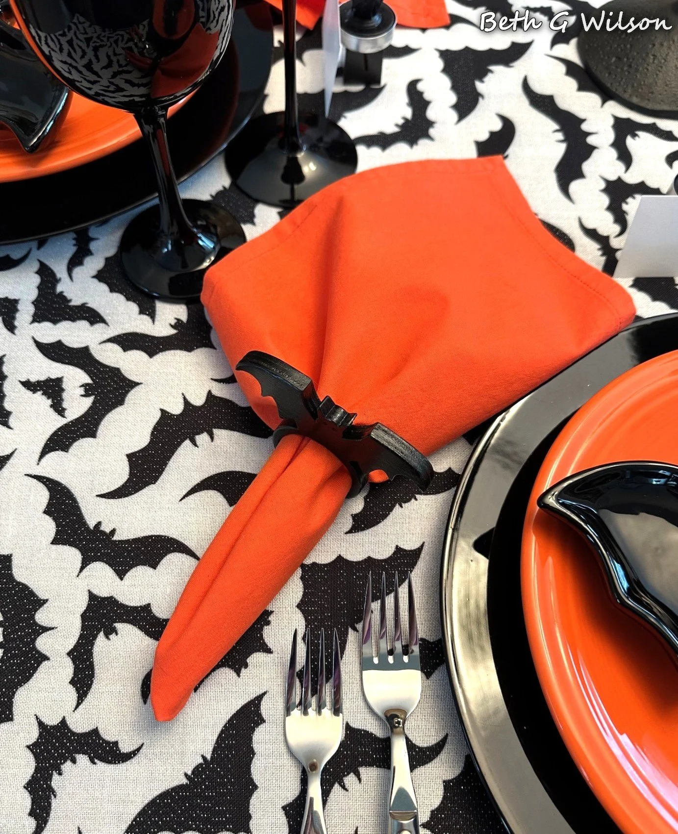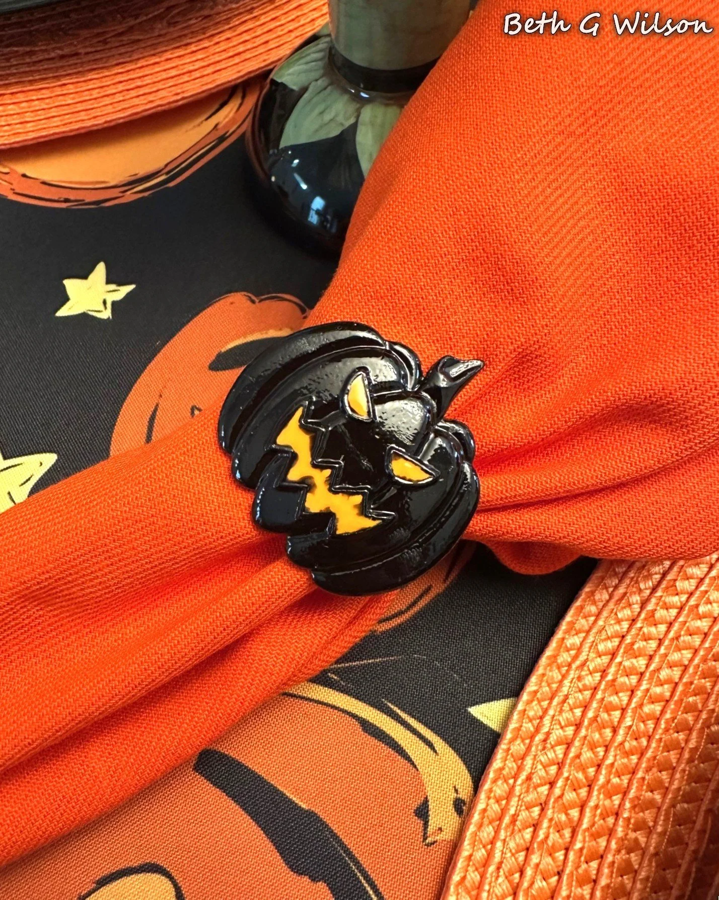 I bought the black cotton napkins at World Market online a few years ago. I have some black polyester napkins but I really like cotton napkins the best. I have bought several sets of solid color napkins at World Market over the years. The orange and black argyle pattern napkins came from Etsy a few years ago. I found the orange metal jack o’ lantern napkin rings at Overstock.com a few years ago. To read about the what, where and how of napkin rings please click here.
