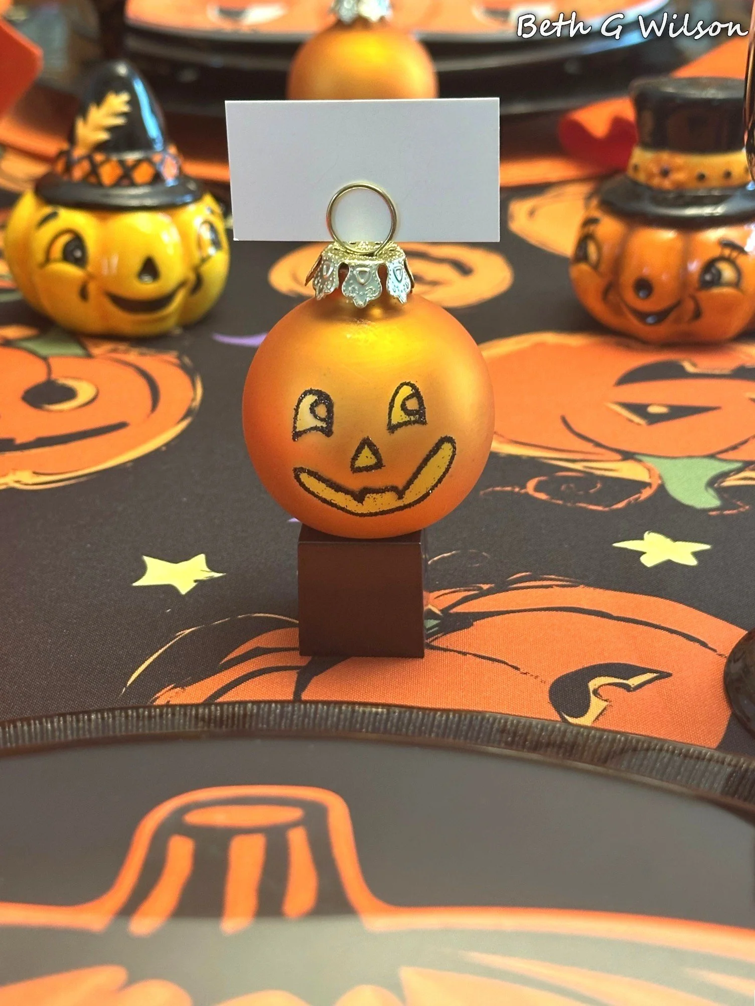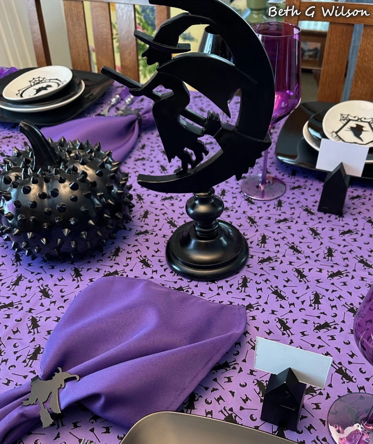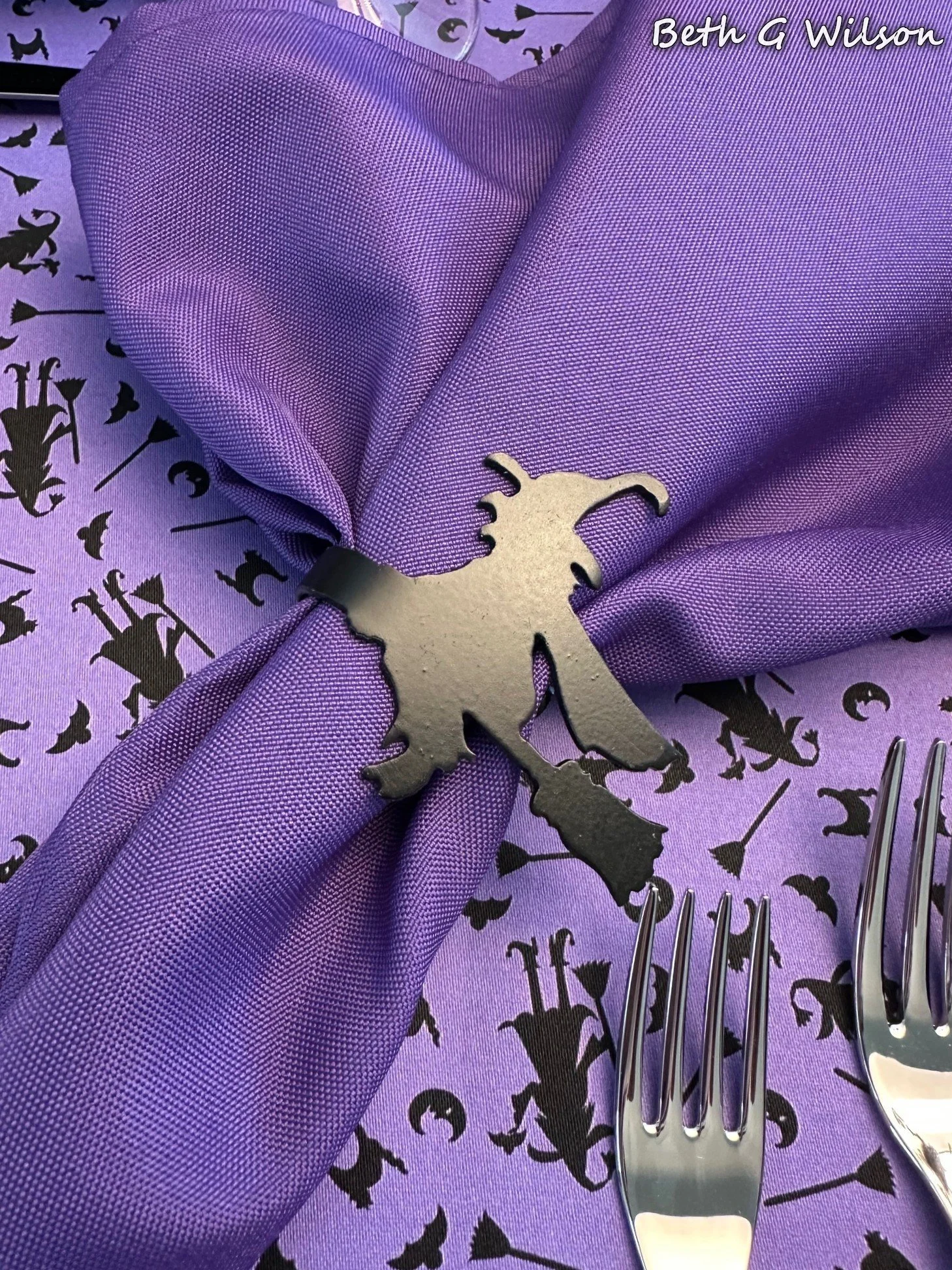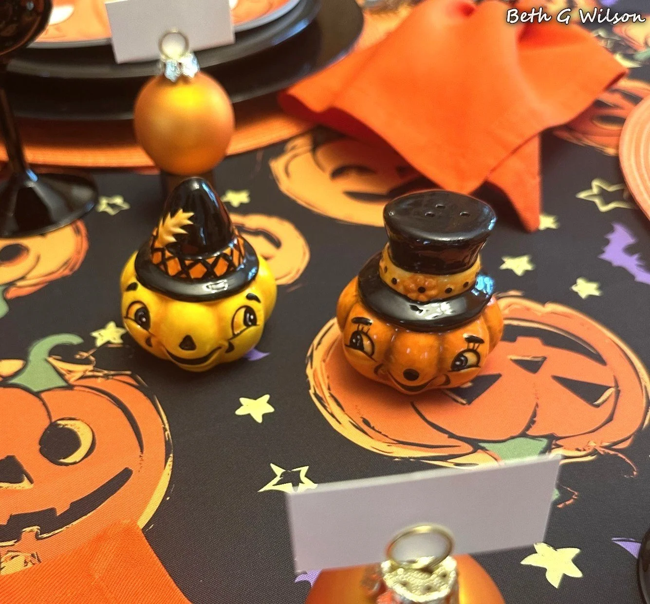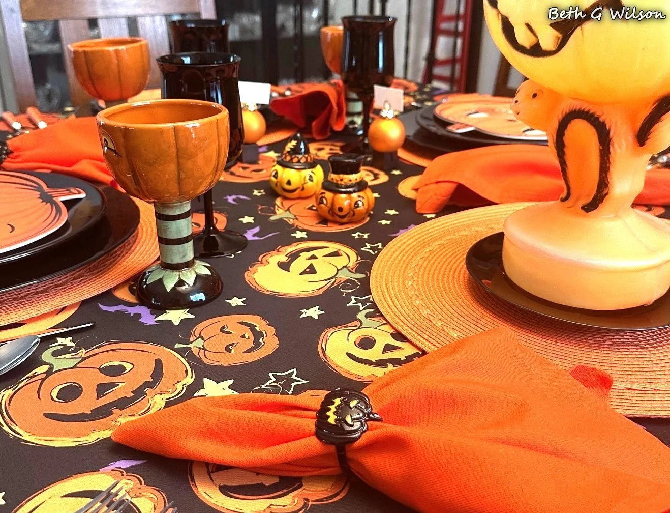 I bought the black cotton napkins at World Market online a few years ago. I have some black polyester napkins but I really like cotton napkins the best. I have bought several sets of solid color napkins at World Market over the years. The orange and black argyle pattern napkins came from Etsy a few years ago. I found the orange metal jack o’ lantern napkin rings at Overstock.com a few years ago. To read about the what, where and how of napkin rings please click here.