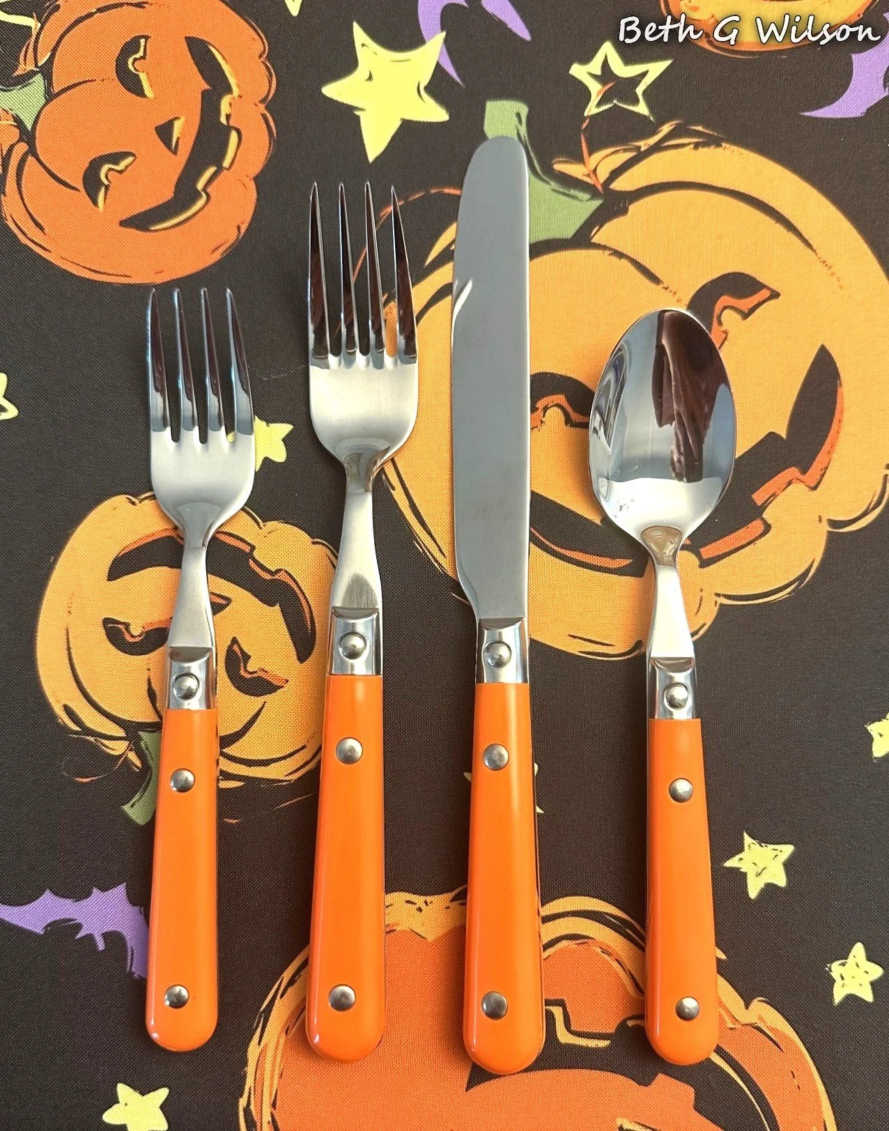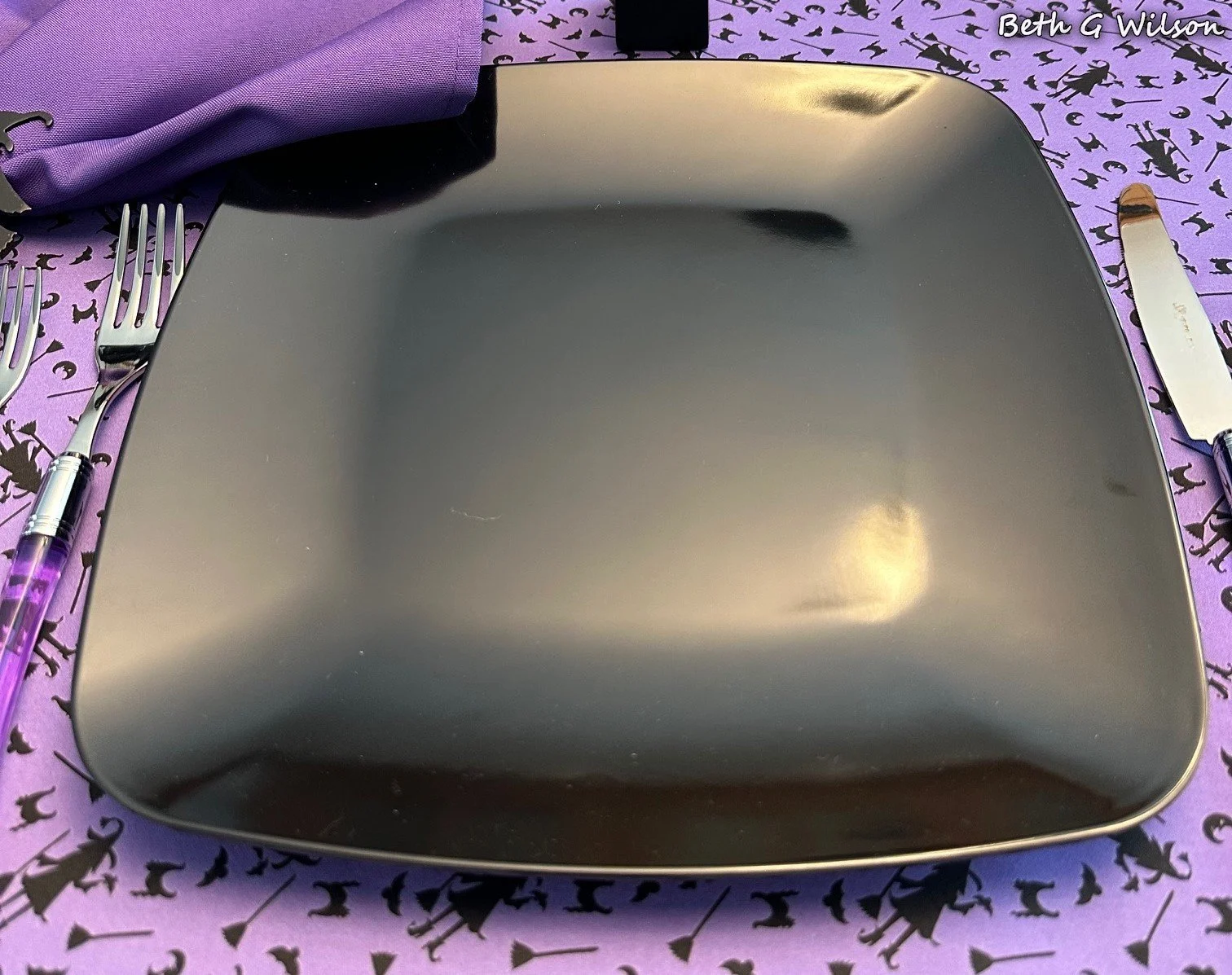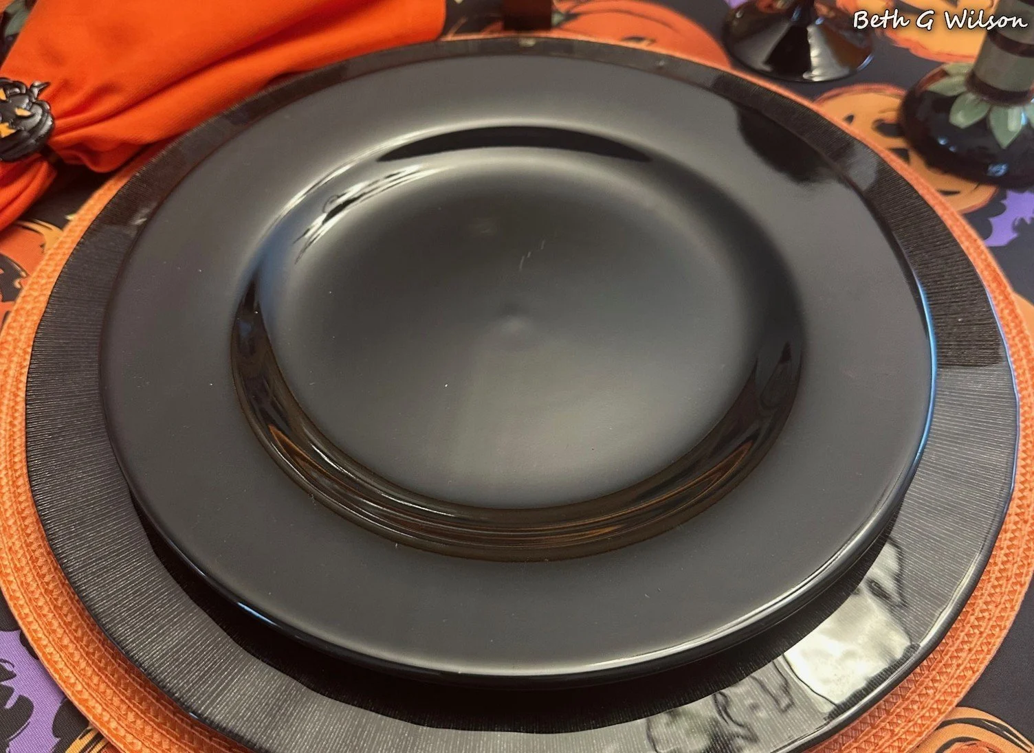 This black flatware is Ginkgo International LePrix. I have had this set for years and it came from Overstock.com. If you read my blog you have seen this flatware on some of my other Halloween tablescapes also. It is in constant use in October. You can read my blog post about what to consider when you are buying flatware here.