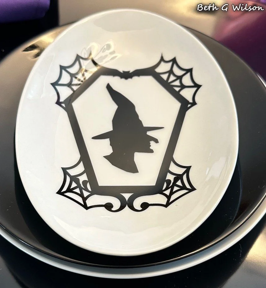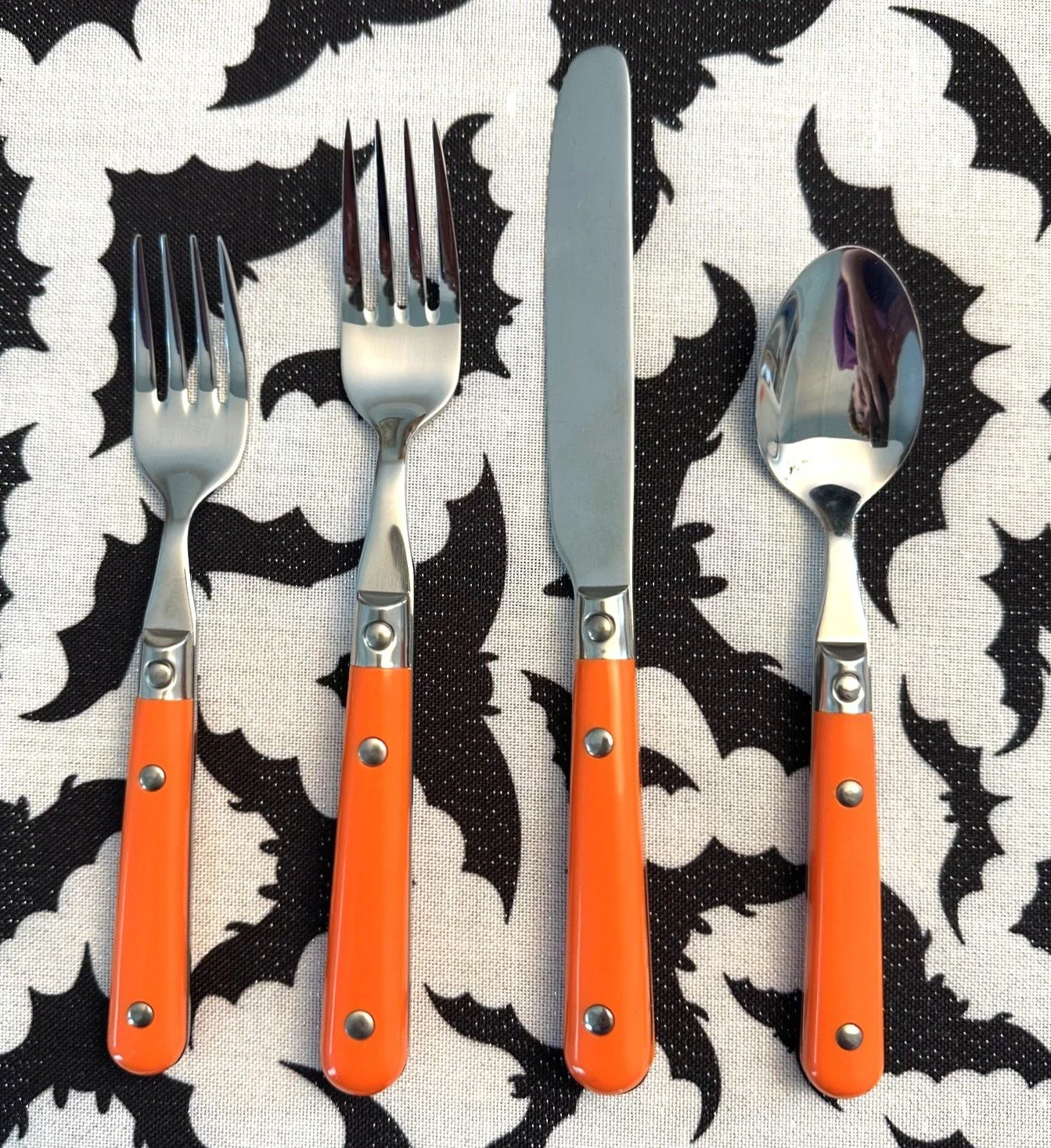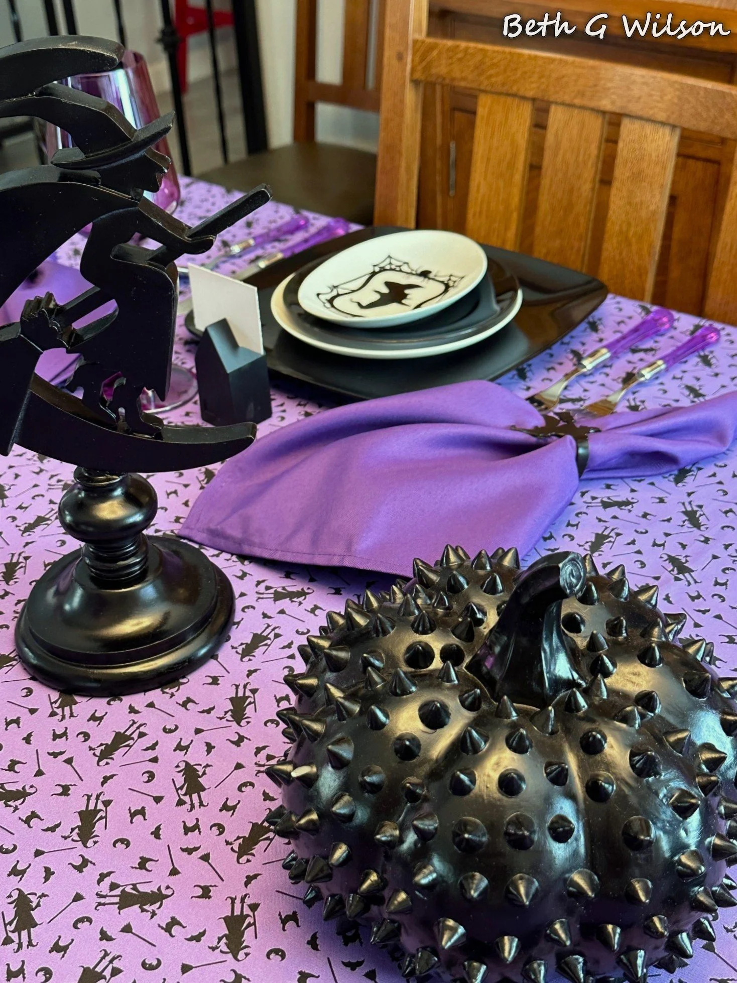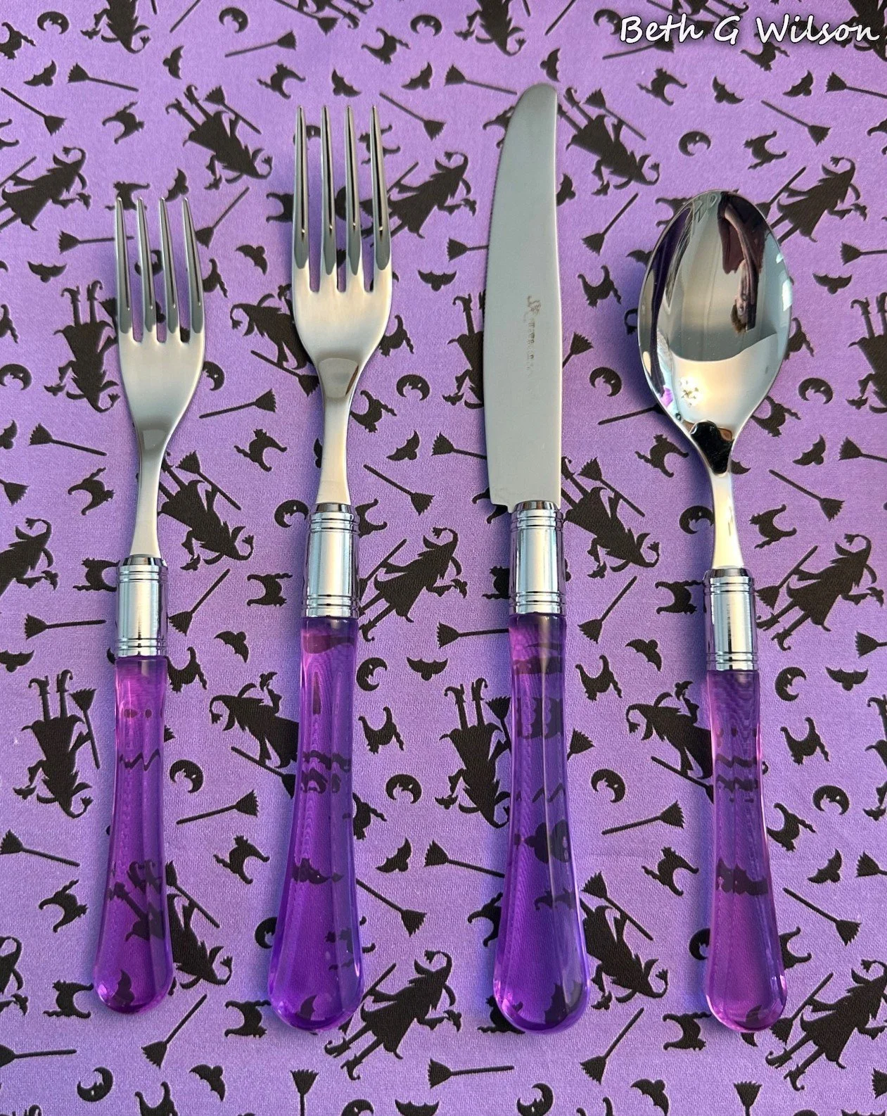 This black flatware is Ginkgo International LePrix. I have had this set for years and it came from Overstock.com. If you read my blog you have seen this flatware on some of my other Halloween tablescapes also. It is in constant use in October. You can read my blog post about what to consider when you are buying flatware here.