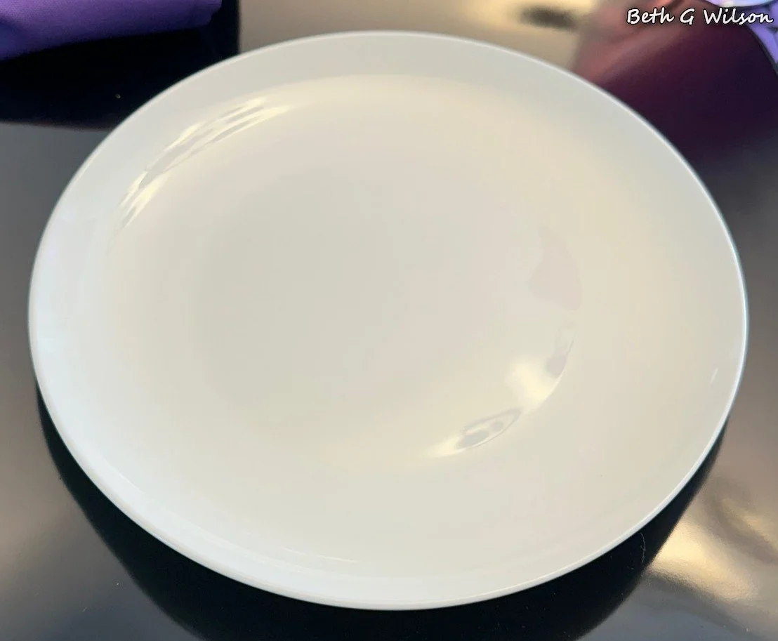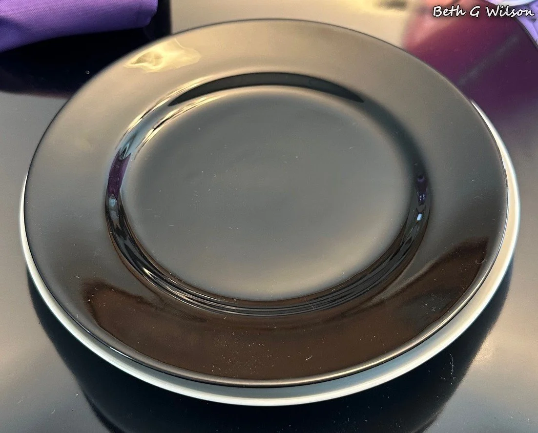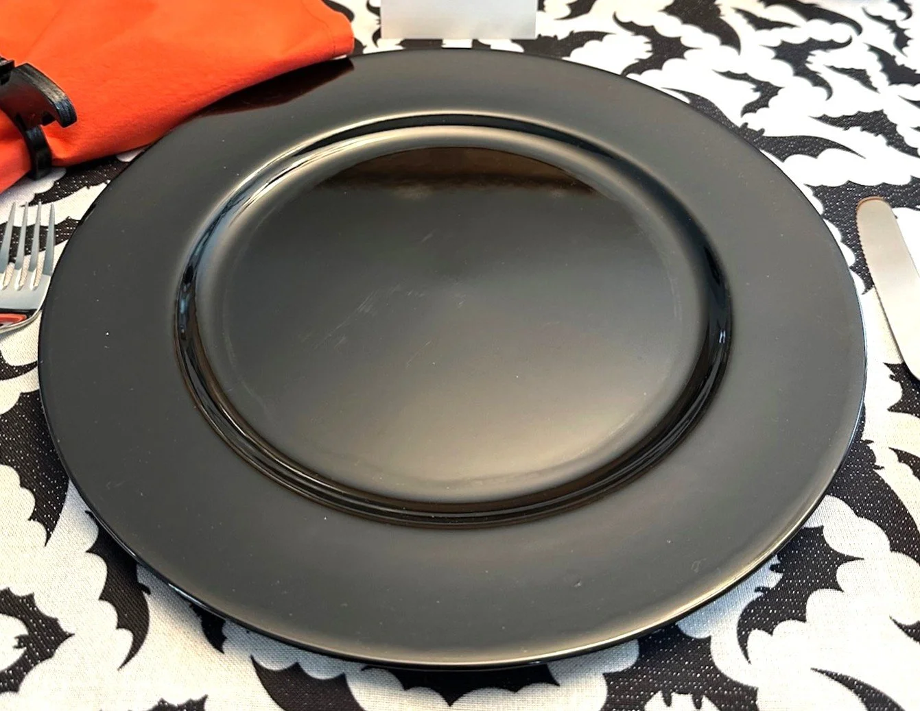 This black glass Starburst charger is called Charge It and was made by Jay. I bought them several years ago on Amazon. They are heavy glass and work well with many different color schemes. A black charger with a simple design is a good starter charger plate if you are thinking about starting a tablescaping hobby.