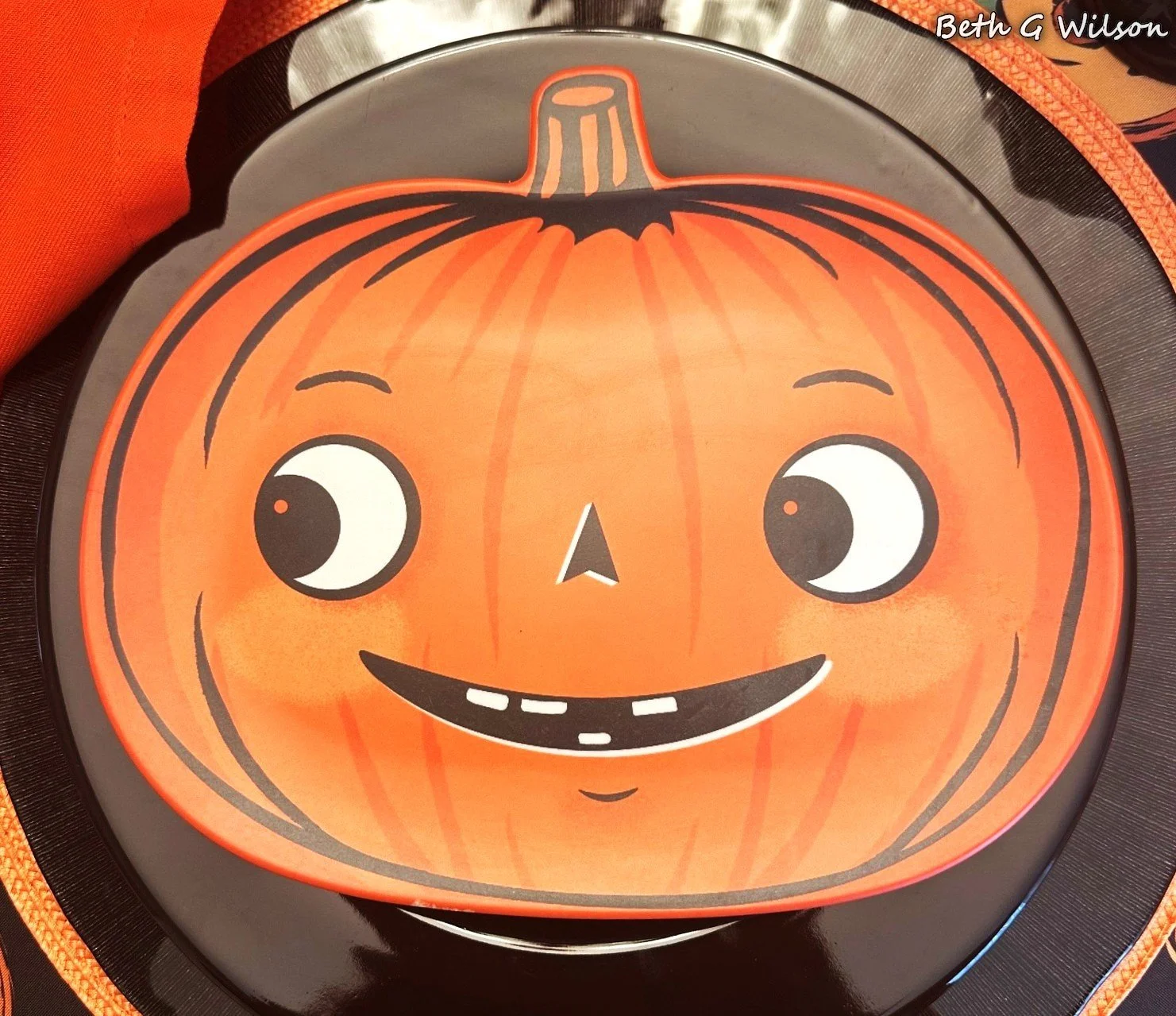 I bought this jack o’ lantern salad plate at Pottery Barn several years ago. I had been looking for a simple jack o’ lantern plate for a couple of years and was so happy to find this one. You can see it on one another Halloween tablescape here.
