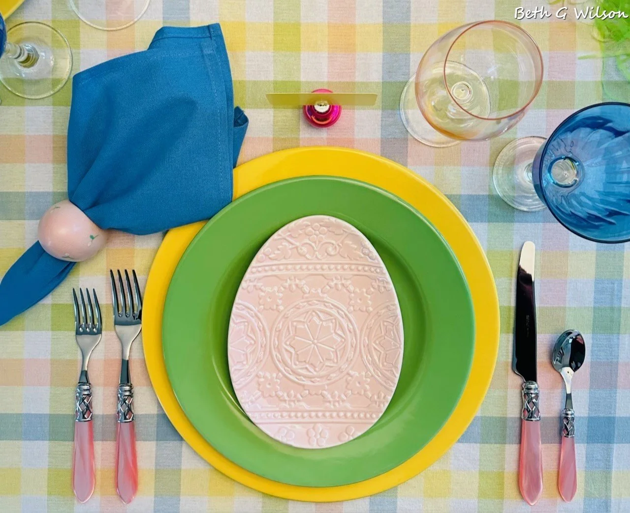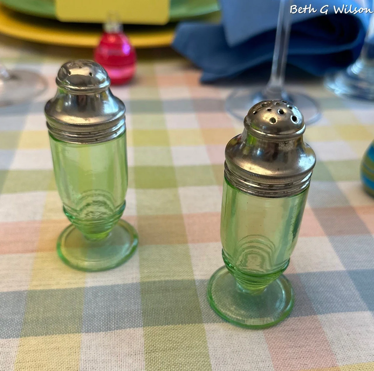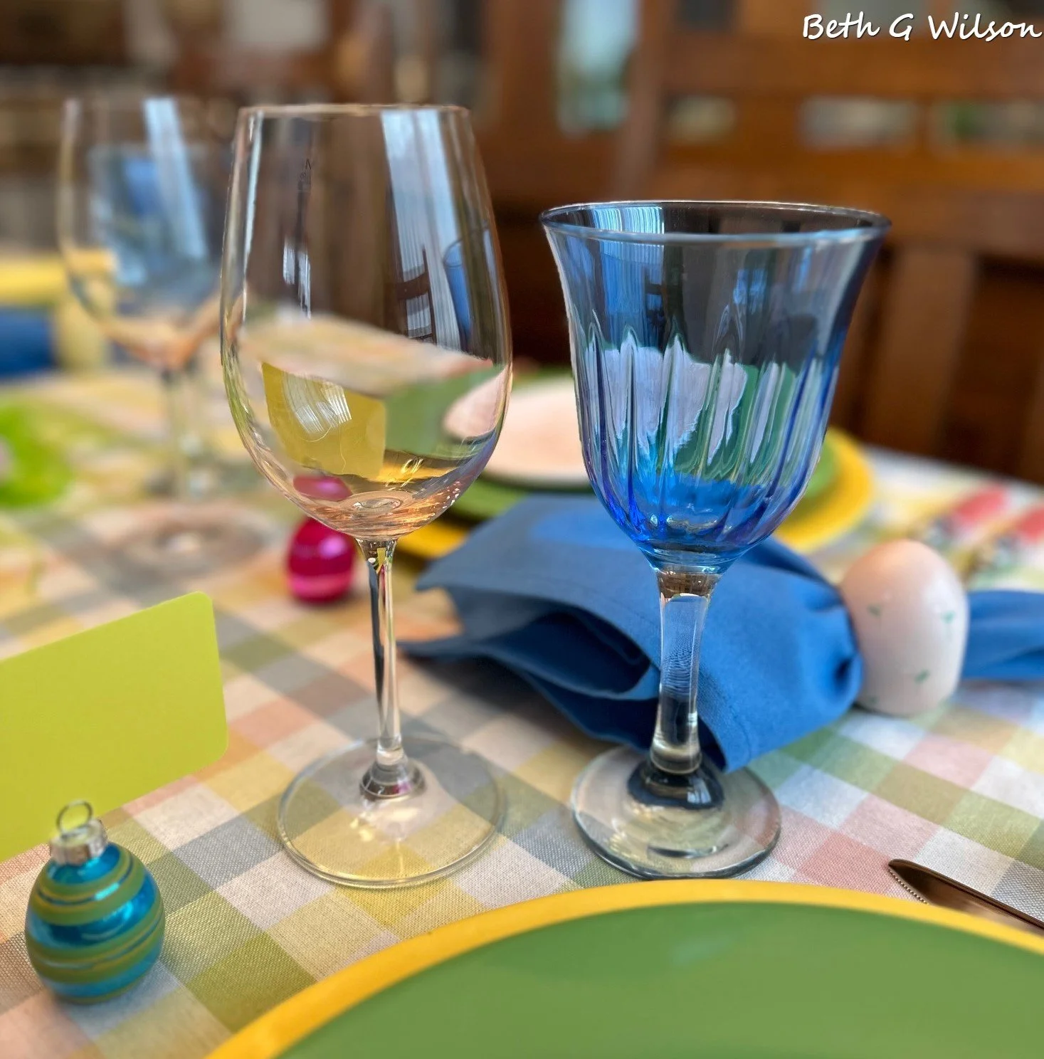 The green acrylic goblets on the left came from our Pier 1 store before it closed several years ago. I think I bought the blue goblets on the right at Pier 1 too. When I started tablescaping I didn’t pay attention to the height of the goblets that I was buying and I soon learned that I like them to be taller like these two. You can read my blog post about what to consider when you are buying goblets for your tablescaping collection including the goblet colors that I use most often here.