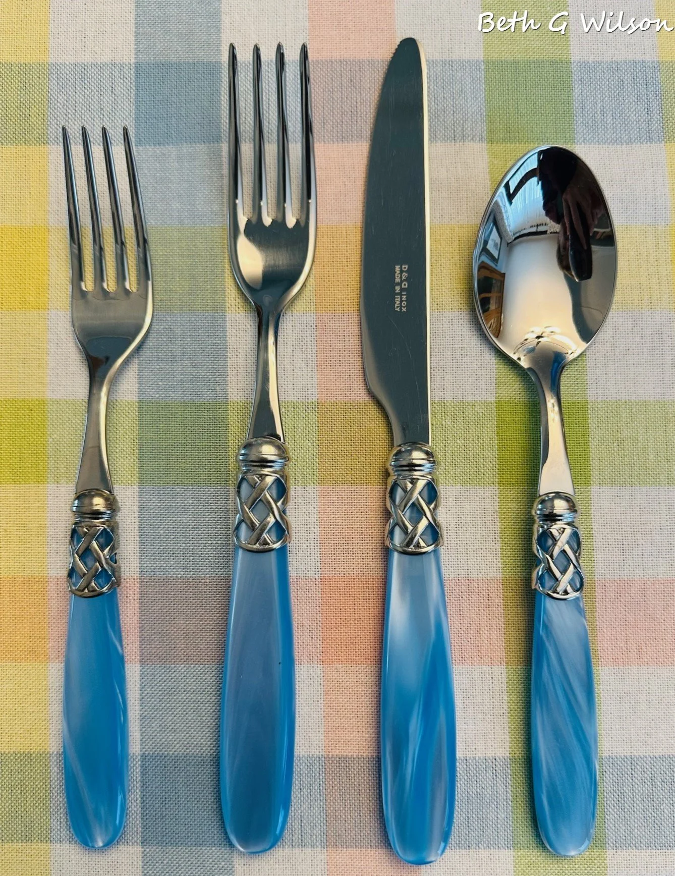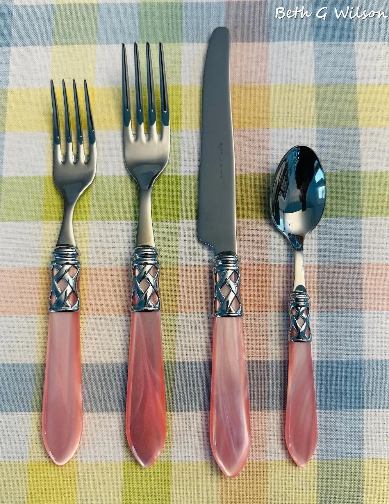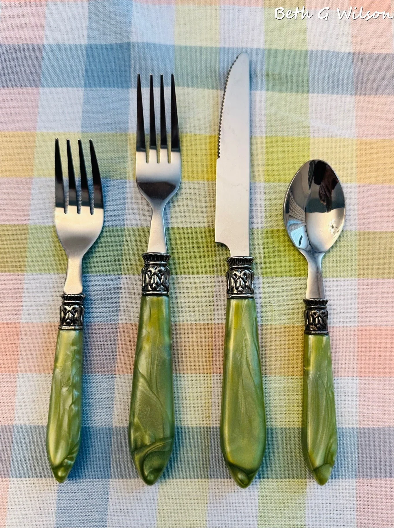 This flatware is called Madeline Green and I bought it at World Market several years ago. If you read my blog you have seen it several times on my tablescapes. I use this green flatware often in the Spring and Fall. If you google frosted flatware and add the color you are looking for you will find similar sets. You can read my blog post about what to consider when you are buying flatware here.