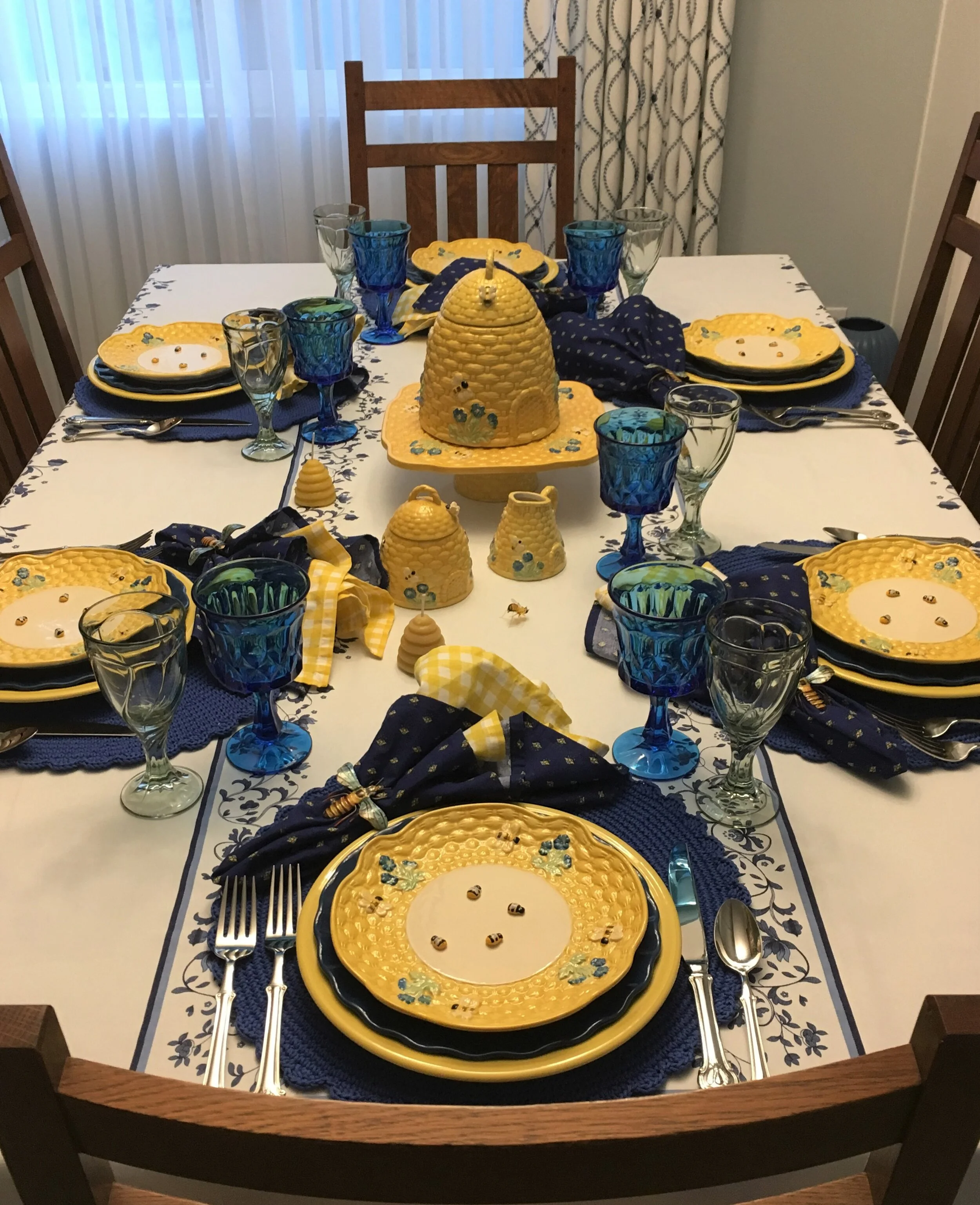 It was Summertime and lots of bees were buzzing in the garden. This was one of my most popular tablescapes this year. More information at: https://www.whispersoftheheart.com/blog/2019/3/27/let-it-bee-spring