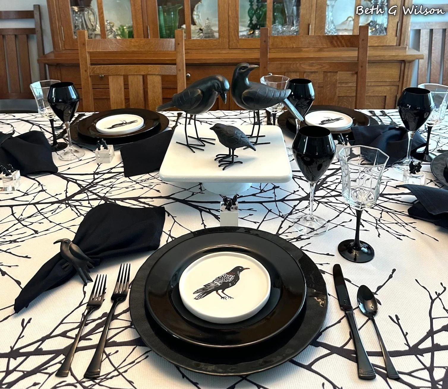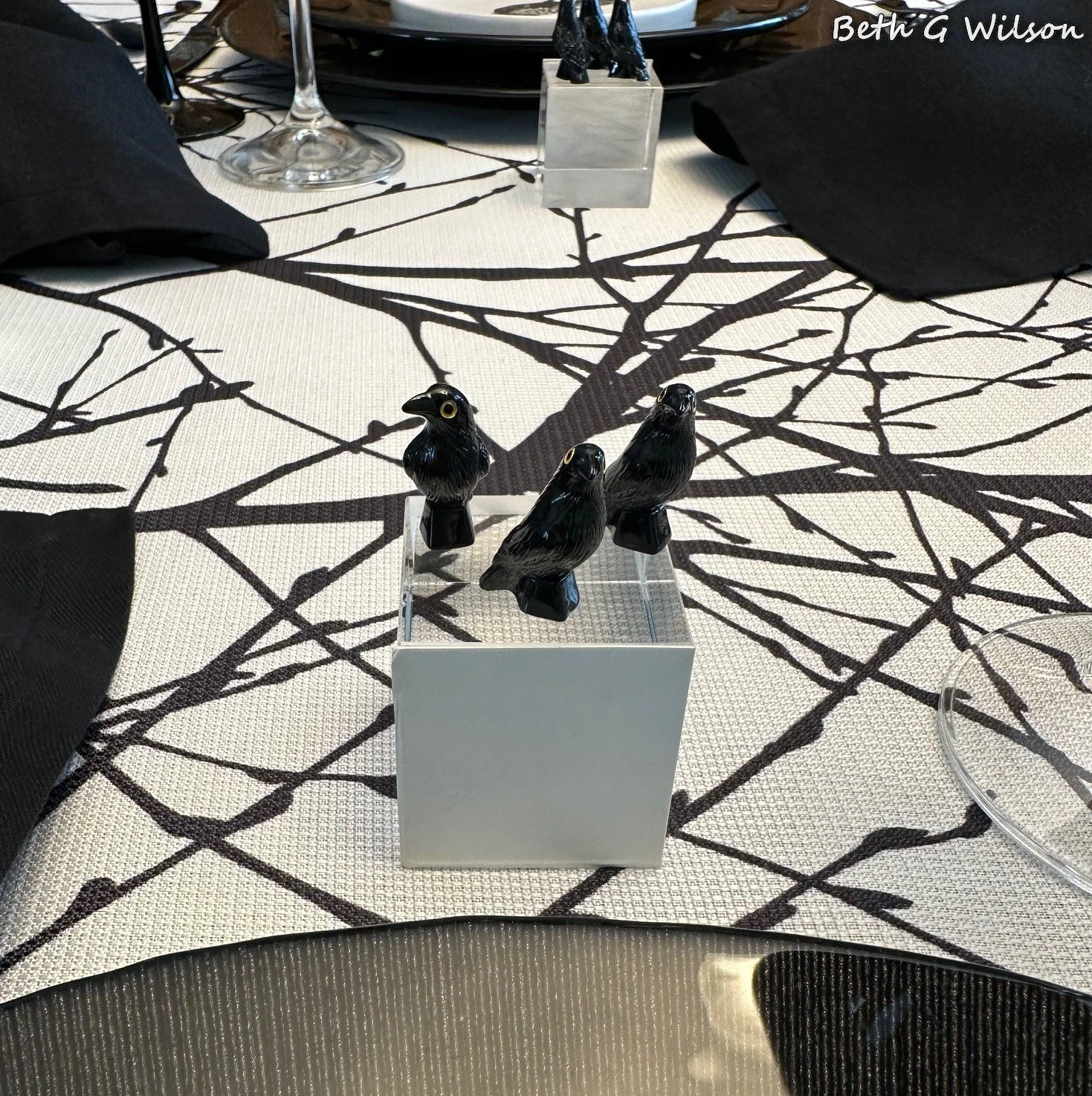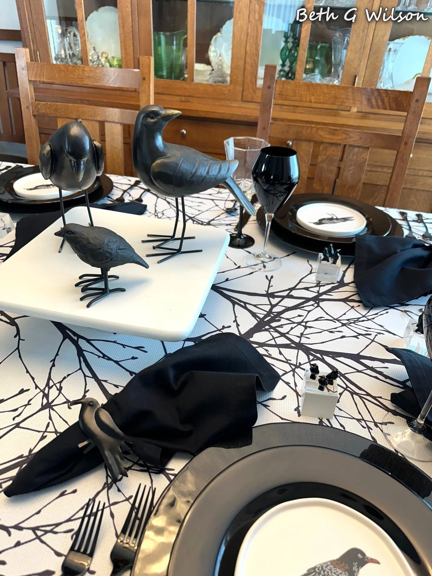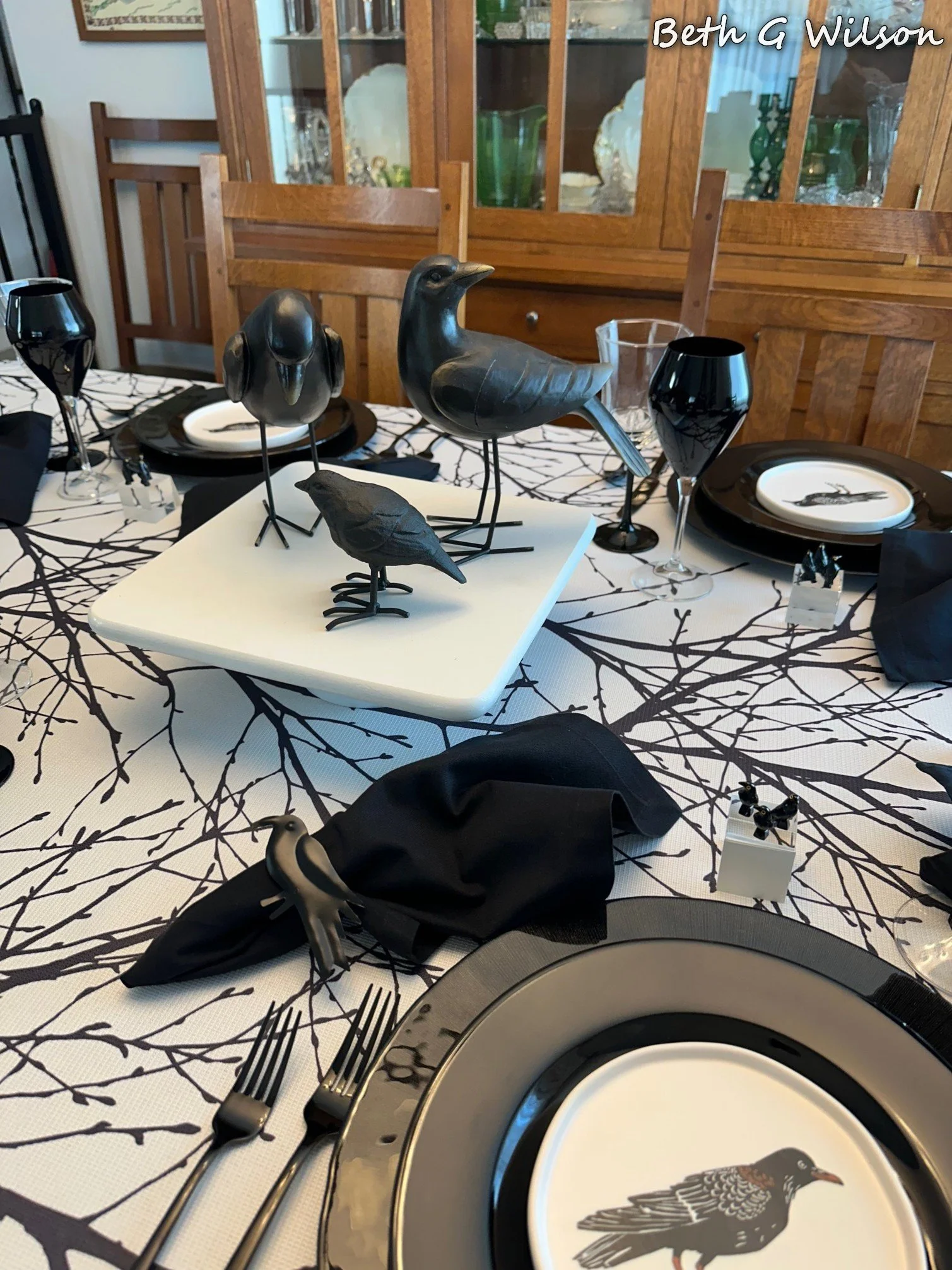 I have been thinking about a Crows themed Halloween tablescape for a couple of years now and I finally got it done this year. I create a new tablescape every week and post it on my blog. I have done over 25 different Halloween themed tablescapes and I keep looking for new themes. You can see all of my Halloween tablescapes and the other 250+ tablescapes that I have done here: https://www.whispersoftheheart.com/tablescapes When I saw this black tree branches on white tablecloth on Amazon several years ago I knew that it would be a good choice for Halloween tablescapes. The tablecloth was made by Fmfunctex. Sometimes I like to create tablescapes that are just two colors, I have done a few black and white ones. When I do this sometimes someone feels the need to make a comment saying that the tablescape would be better with a third color. If I had wanted to add another color, I would have. The stark black and white on this tablescape reminds me of Halloween and I like it for that reason.