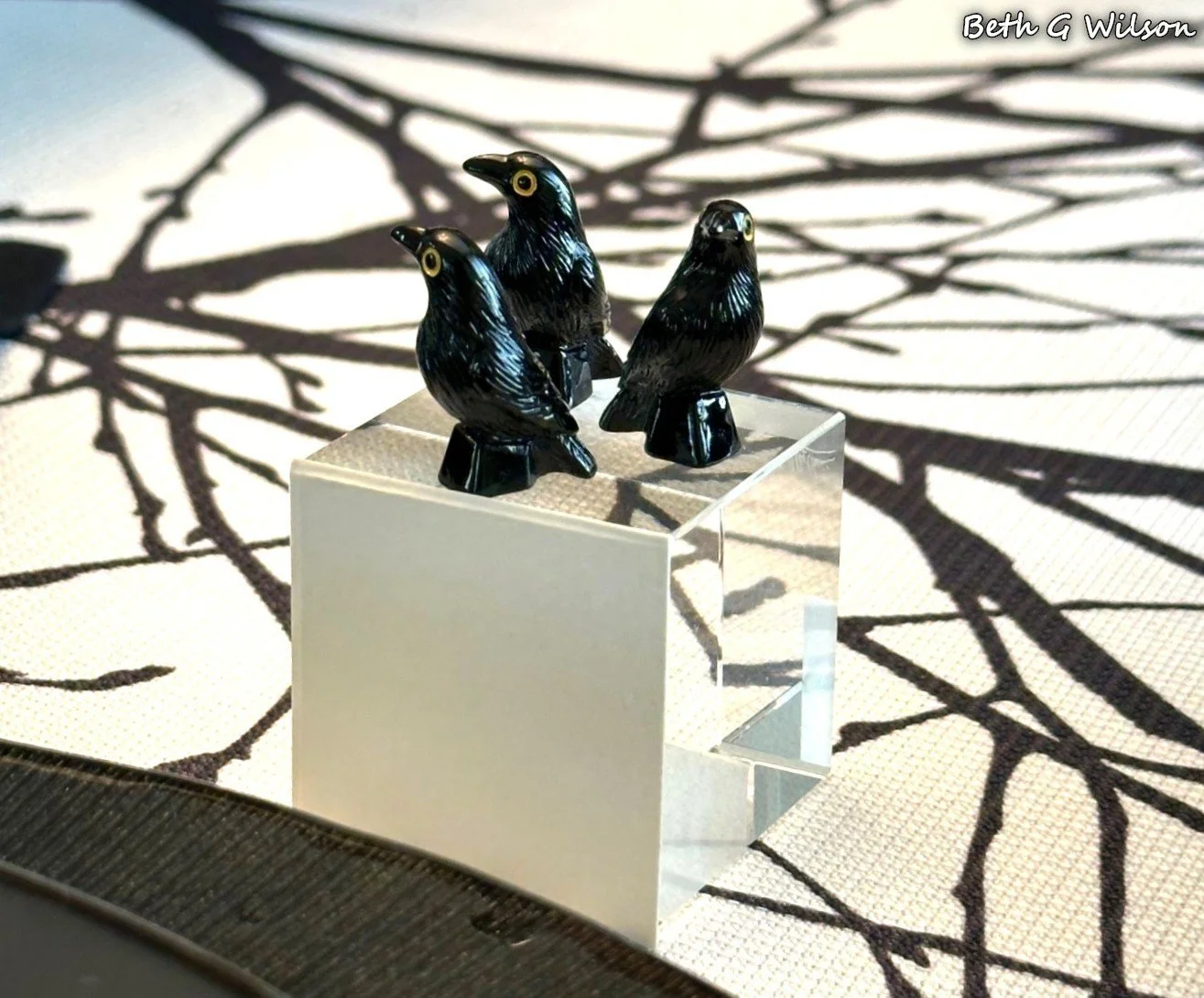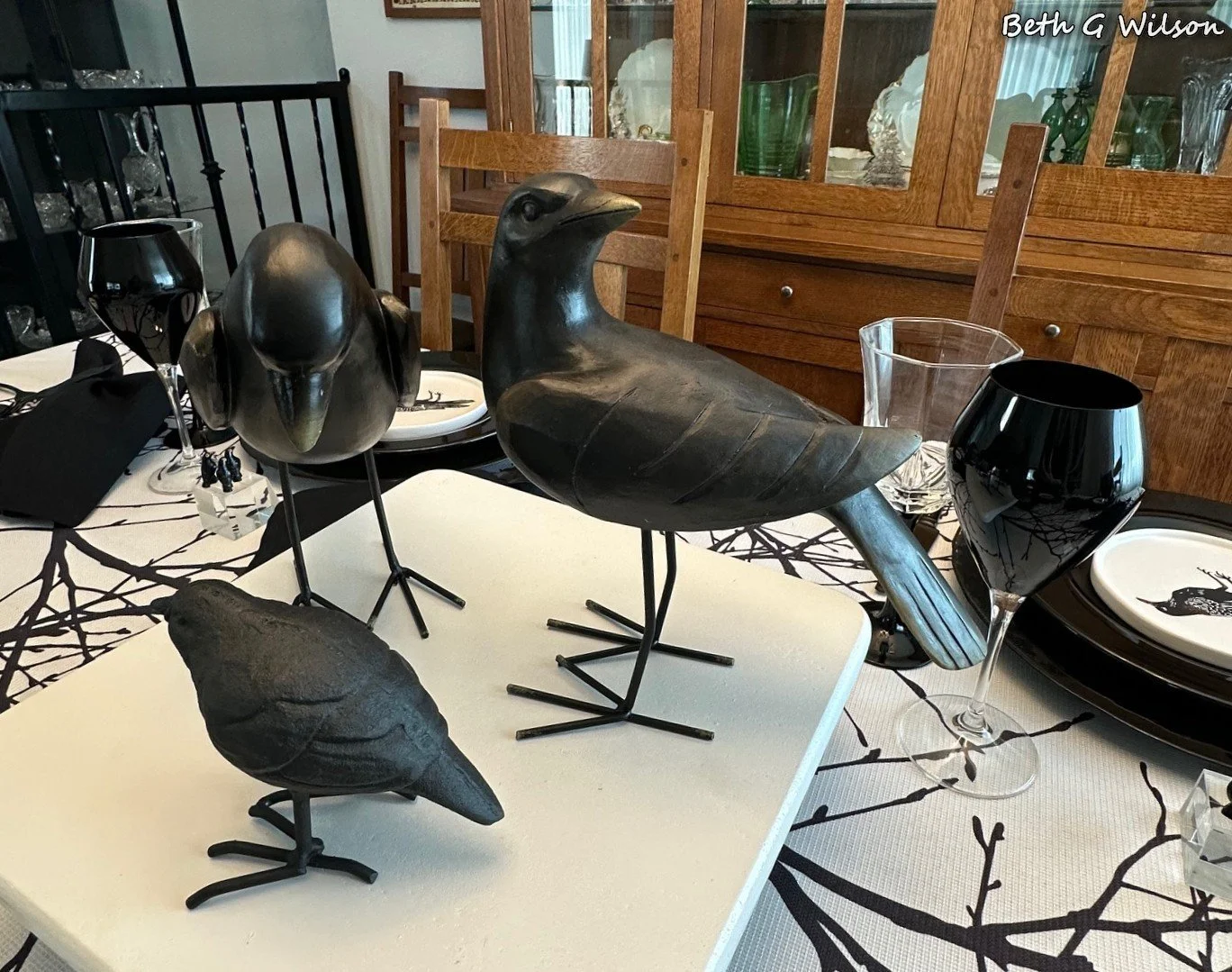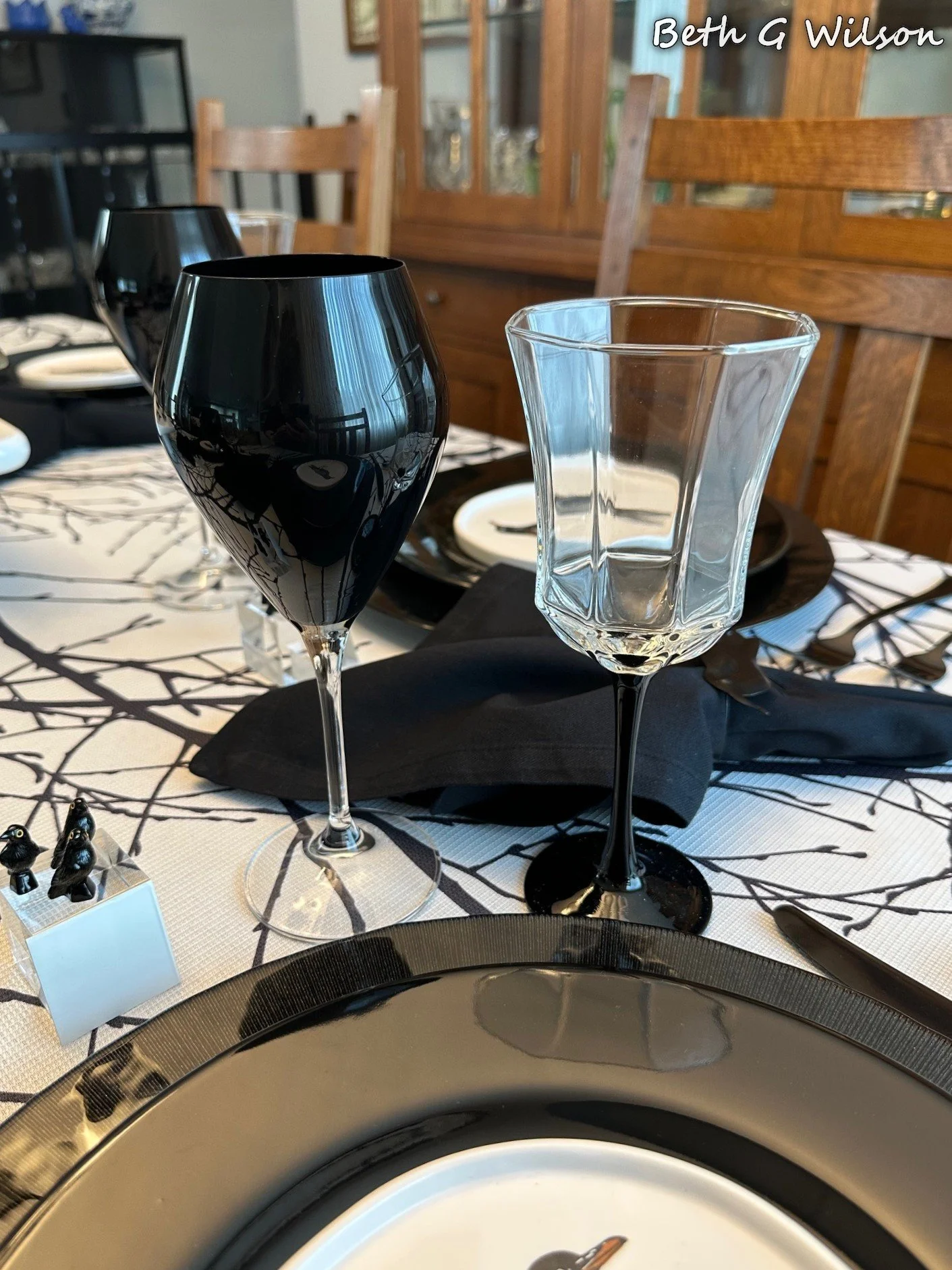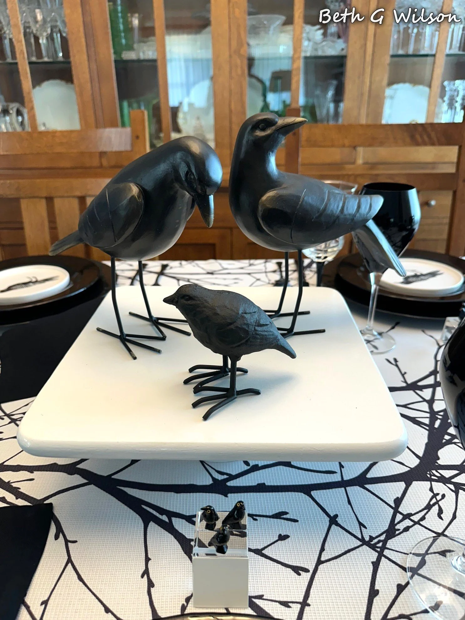 I have been thinking about a Crows themed Halloween tablescape for a couple of years now and I finally got it done this year. I create a new tablescape every week and post it on my blog. I have done over 25 different Halloween themed tablescapes and I keep looking for new themes. You can see all of my Halloween tablescapes and the other 250+ tablescapes that I have done here: https://www.whispersoftheheart.com/tablescapes When I saw this black tree branches on white tablecloth on Amazon several years ago I knew that it would be a good choice for Halloween tablescapes. The tablecloth was made by Fmfunctex. Sometimes I like to create tablescapes that are just two colors, I have done a few black and white ones. When I do this sometimes someone feels the need to make a comment saying that the tablescape would be better with a third color. If I had wanted to add another color, I would have. The stark black and white on this tablescape reminds me of Halloween and I like it for that reason.