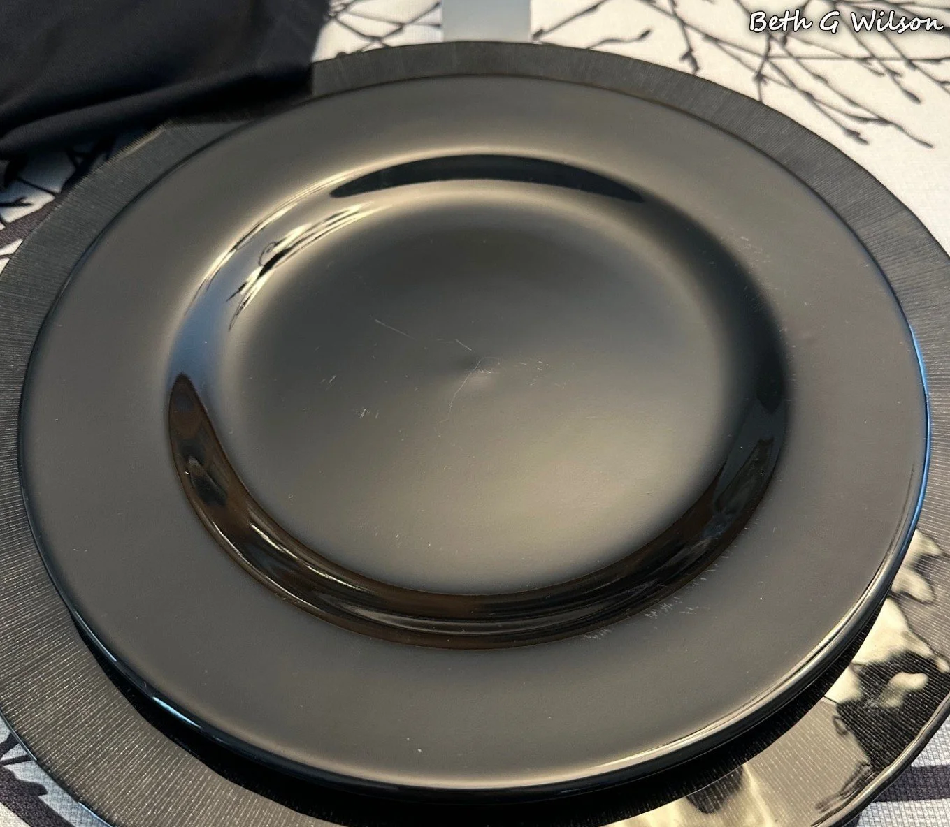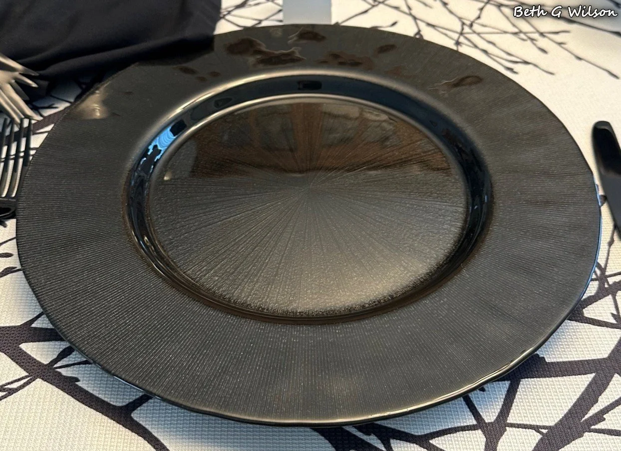 This black glass Starburst charger is called Charge It and it was made by Jay. I bought them several years ago on Amazon. They are a heavy glass and they work well with many different color schemes. A black charger with a simple design is a good starter charger plate if you are thinking about starting a tablescaping hobby.